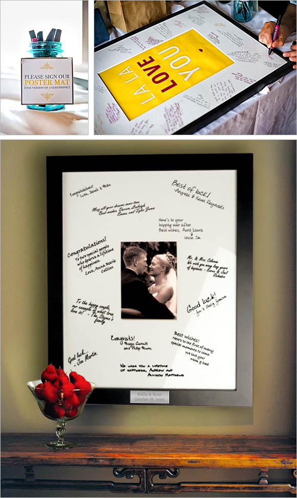 You can celebrate your wedding day with a photo frame of your guests best wishes around a photo of your choosing. Choose acid free fine point pens for your guests to write on the matting poster for your wedding photograph.