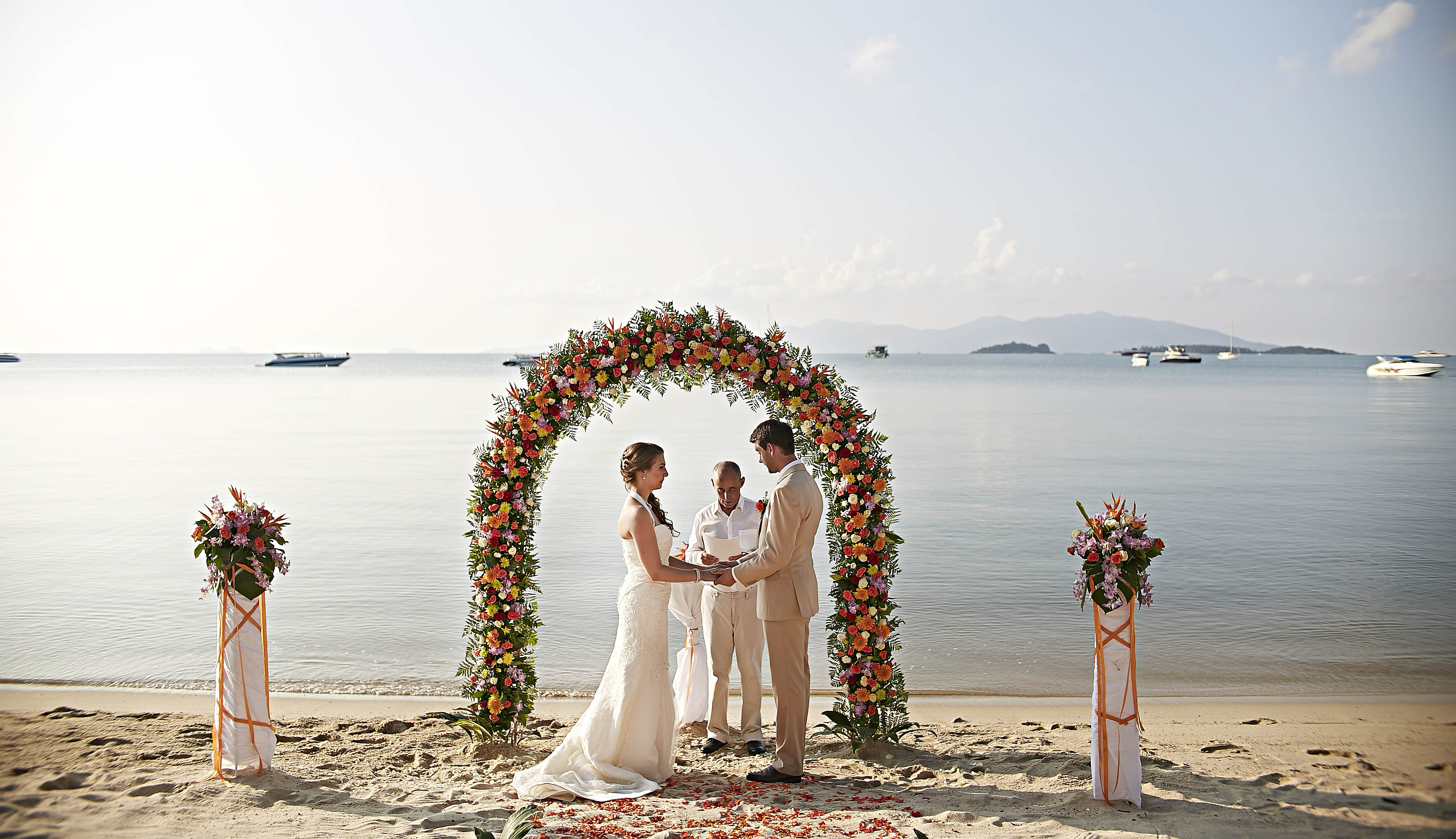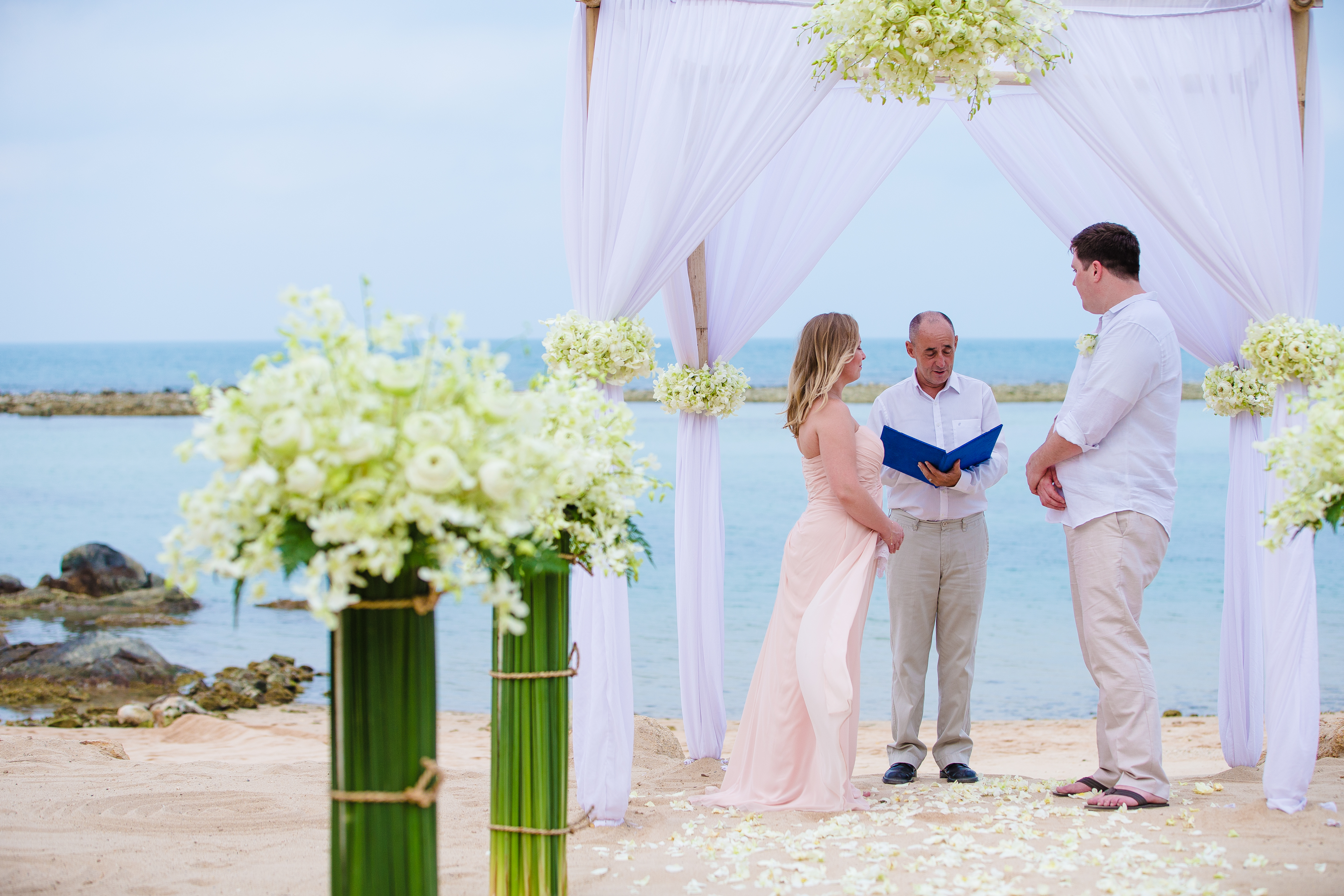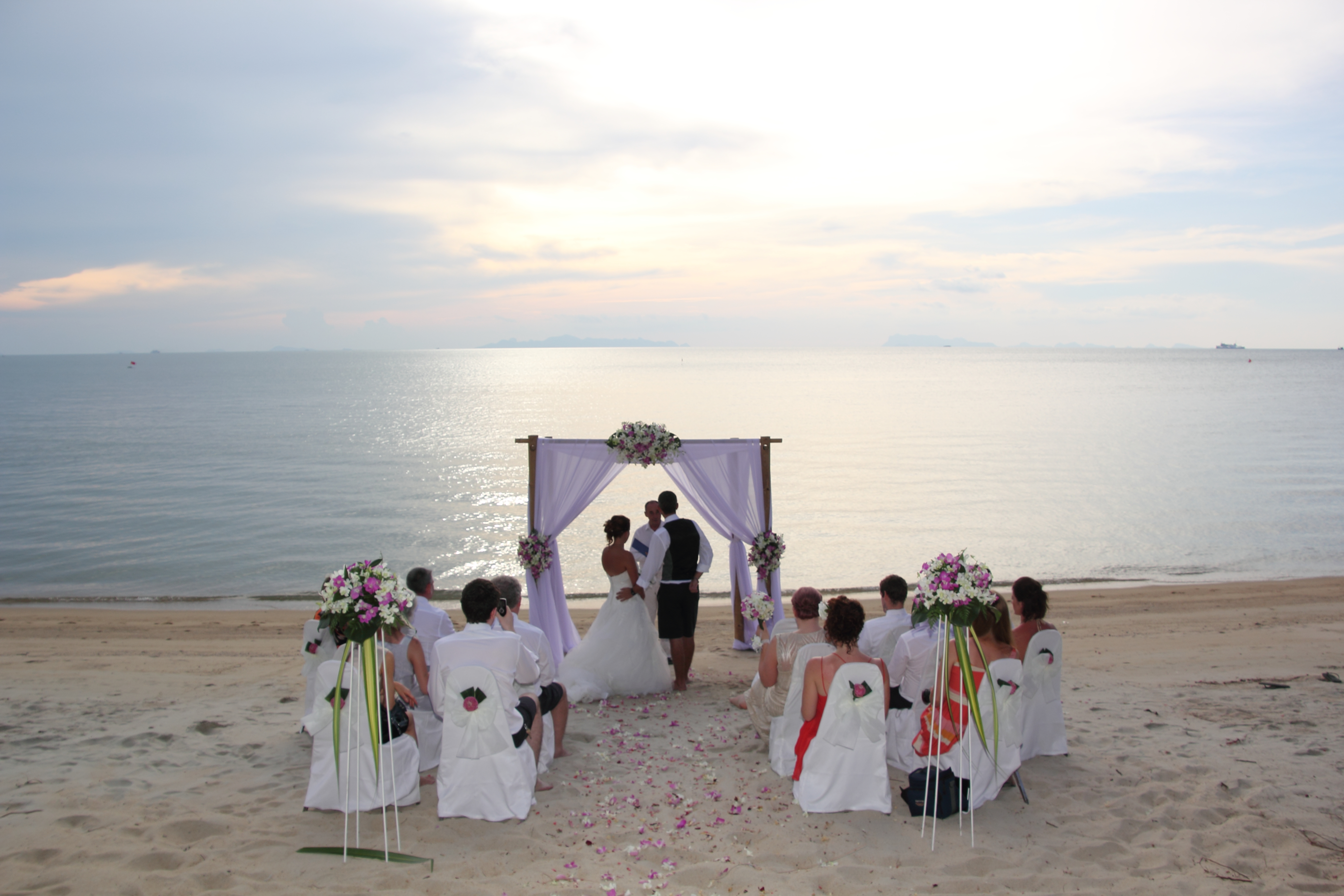 From phone contact (Australia to Koh Samui) to the choice of photographer, makeup artist and beach location, we were provided with quality and all of our wishes were met without any disappointment. Dimitri spoke genuinely and in a warm and appropriate tone when marrying us. We would absolutely recommended their services and we hope you choose Dimitri to marry you!